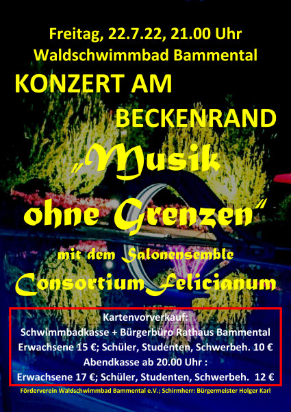 In diesem Jahr wird das deutschlandweit konzertierende Salonensemble mit dem aus Bammental stammenden 1. Geiger Arne Müller „Musik ohne Grenzen“ präsentieren – angesichts der aktuellen Situation sicher nicht ganz ohne Hintersinn. Im wie immer von Jürgen Daum prächtig illuminierten Schwimmbad wird man den Übergang vom Tag in die Nacht nicht nur mit herrlicher Musik, sondern auch mit Abendgesängen der Singvögel und sicher irgendwann auch wieder mit Rufen des Waldkauzes aus dem nahen Wald erleben – und zumindest der Halbmond wird den hoffentlich wie immer wolkenfreien Himmel beleuchten.