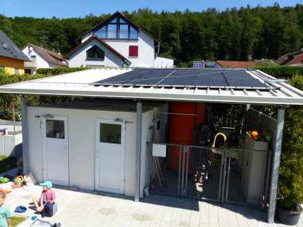 Nicht ausreichend war bisher die Aufheizung des Wassers für das Kinder-Planschbecken. Aber auch an nicht ganz so heißen Tagen wollen die Kleinsten ins Wasser. Um das zu ermöglichen hat der Förderverein dafür gesorgt, dass nun auch hier die Wärme der Sonne genutzt wird. Gut 8 000 € kostete die Solarthermie-Anlage, die jetzt auf dem kleinen Umkleidebereich – übrigens auch ganz wesentlich vom Förderverein finanziert und erbaut - neben dem Planschbecken installiert wurde.